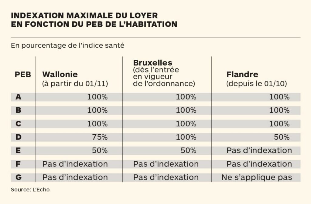 - En Région bruxelloise, les loyers des logements disposant d’un PEB E peuvent être indexés de 50% maximum.