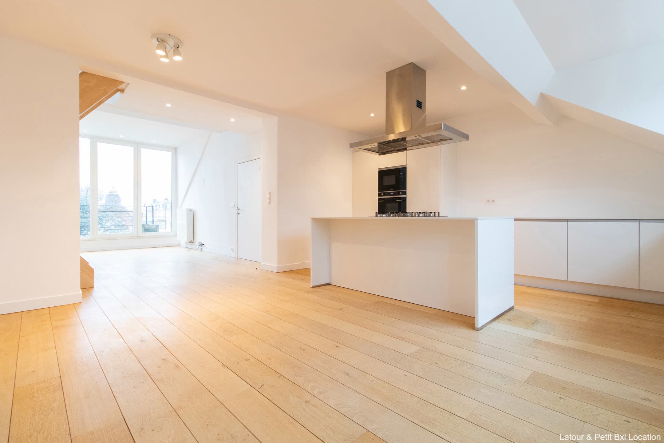 A l'étage, spacieux séjour/salle à manger de ±41m² donnant accès à la terrasse végétalisée - vue dégagée sur le Palais de Justice de Bruxelles. Cuisine super-équipée avec îlot central. En mezzanine, bel espace bureau ou salle de jeux de ±14m².